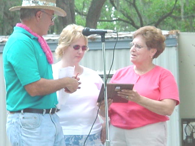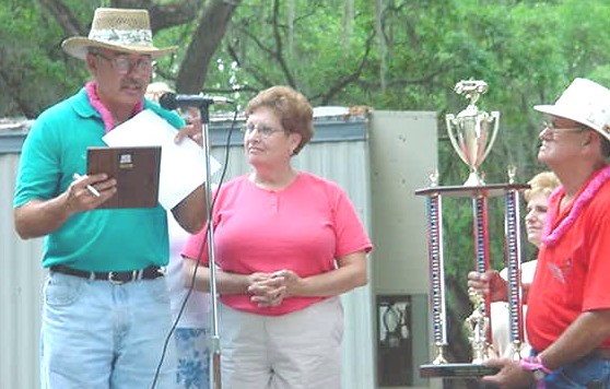 OC presented Dottie Gillis with a plaque honoring her husband, Wilbert, who did so much for our Club... the Club voted to give a trophy in Memory of one of our departed members every year and this year we had Dottie pick the winning car... OC explained this to the crowd while Dottie and Wilbert's best friend, Bobby Phillips, looked on with the trophy ...